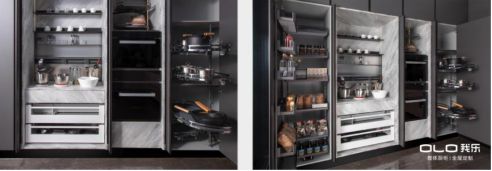 “关起门来好看,打开门来好用”是我乐厨柜新品“星云”系列多功能高柜系统的功能亮点,也是我乐第十代智慧厨房的亮点之一。