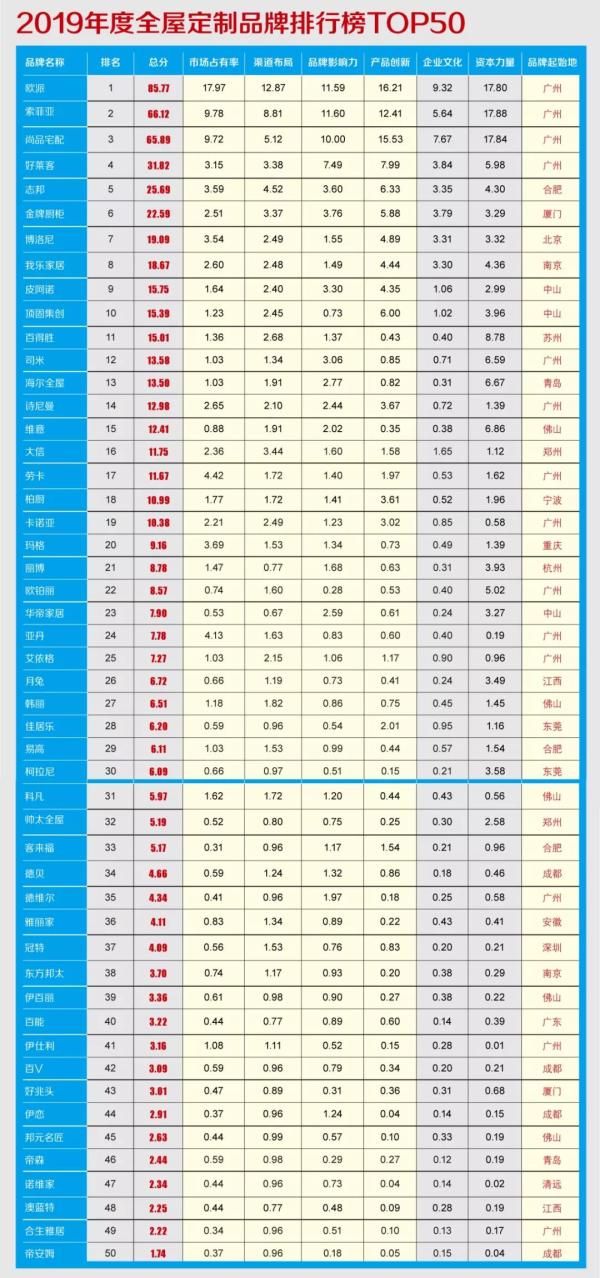 2019年度全屋定制家居品牌价值排行榜TOP50重磅发布