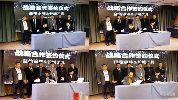 随后河北晨阳工贸集团(晨阳水漆)、石家庄市油漆厂(金鱼水漆)、境洁环保科技(上海)有限公司(益涂涂料)、人民幸福集团北京玛雅森林(北京)国际科技有限公司四家,在涂料和装饰行业的知名企业与保定英特盛鬃刷制造有限(长城工具)分别签署了战略合作协议。