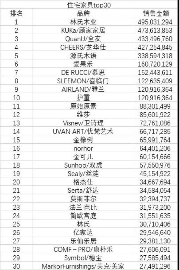 春谈会提供了住宅家具交易额TOP30的名单,有几家店铺是常年位于前列的(具体可参考我们前期的分享),也有一些店铺是新新面孔。