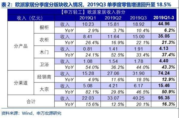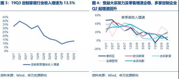 19Q3单季角度:受2B大宗渠道发力+龙头零售增速企稳,Q3行业整体增速进一步回暖。行业收入增速阶段性略有回升至13.5%(2019Q1/Q2同比增长9.5%/12.3%)。Q2-Q3同比增速逐季提升,一方面系橱柜系公司大宗业务收入高增长拉动,例如金牌厨柜Q3大宗业务增速超过100%、志邦家居Q3大宗增速超50%,欧派家居Q3大宗增速46.5%;另一方面,行业龙头欧派家居经销渠道增速大幅提升,带动行业收入增速略有回升。