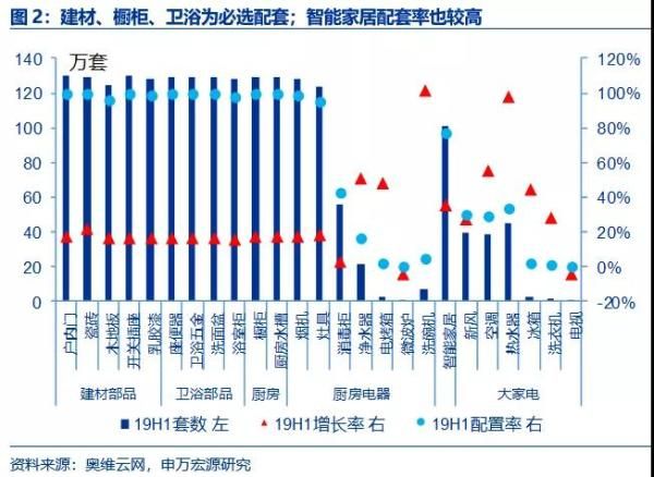 头部房企精装修比例相对较高,建材、橱柜、卫浴基本为100%配套,相关公司2B业务快速起量。根据奥维云网统计,19Q1-3同期共有精装房190.1万套。头部房企精装修比例相对较高,TOP10房企精装房占总量43%(数据截至19H1),而排名50以下的房企精装修房屋量仍处于高速增长中。按配套品类来看:建材(门、地板、瓷砖)、卫浴(卫生洁具、五金、浴室柜)、橱柜等基本为100%配套产品,智能家居产品(门锁、安防、马桶、晾衣架、灯光、窗帘等加总)配套率也较高,呈快速增长态势。