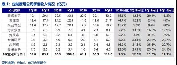 欧派家居:龙头优势持续显著,占上市企业收入增量的半壁江山。受益于品牌,多品类,以及全渠道精细化管理布局的优势,行业龙头地位持续巩固。2019Q3定制前8家供公司收入合计110.0亿元,欧派家居收入40.3亿元,占比36.6%。前8家单三行业收入增量为13.1亿元,欧派单季度收入增量为6.8亿元,收入增量贡献占比达到52%。