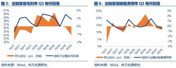 上市公司端毛销差基本稳定。1)大宗业务占比提升对毛利率形成一定拖累:从毛利率口径看,定制家居8家上市公司加权平均毛利率2019Q3同比回落1.1pct。大宗业务占比提升,加之存量大宗业务毛利率下行(如欧派家居大宗业务单三毛利率同比回落6.6%),拖累行业整体毛利率。2)销售费用率下降:定制家具企业精准化费用投放,通过对经销商促销补贴、精准化广告投放,实现高效引流;叠加大宗业务费用端显现规模效应,2019Q3行业销售费用率同比下降1.1pct。