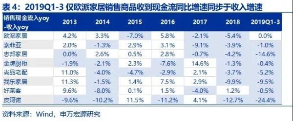 大宗业务中的龙头Alpha:大宗业务盈利能力及质量与大宗模式密切相关,当前定制家居企业大宗业务主要是三类模式:1)总部直营模式(如索菲亚和皮阿诺的恒大合作模式);2)代理商模式(如金牌厨柜);和3)总部代签代理商落地模式(如欧派家居)。代理商模式和总部代签模式均能保证公司现金流良好,总部代签模式还保证了公司良好的利润率。大部分定制家居企业大宗业务均一定比例上选择总部直营模式,对现金流形成拖累;而欧派家居全部采用总部代签模式,2019Q1-3上市定制家居企业中,仅欧派家居实现销售商品收到的现金同比增速同步于收入增速(其他均低于)。