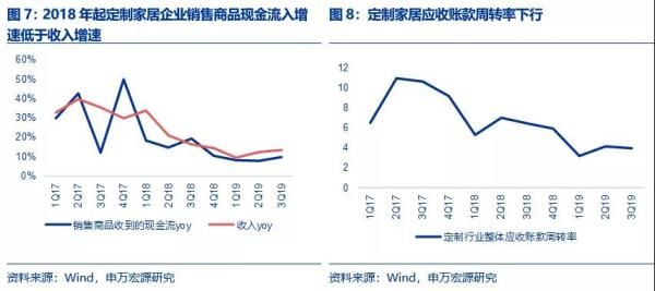 应收账款与现金流:2B工程业务的拓展使得应收账款周转率降低。受精装房趋势影响,定制家居企业(尤其是橱柜为主)工程业务快速增长,工程业务占比持续提升,2019H1大宗占行业整体收入比达到13.0%(2018年为8.9%);工程业务的快速增长对公司收入增长形成一定支撑,但由于工程业务账款回收周期长,公司现金流形成一定压力。受此影响,自2018Q1起七个季度中,除2018Q3外,定制家居企业销售商品收到的现金流入增速均低于同期收入增速;应收账款明显增加,2019Q3定制行业整体应收账款合计值为29.26亿元,同比增加77.3%;对应的周转率4.00,同比降低2.49。