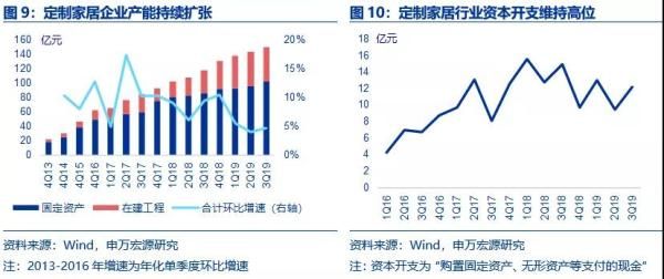 定制家居行业固定资产仍处扩张期。2017年6家定制家居企业密集上市后,定制家居企业纷纷开启全国产能基地的建设步伐,固定资产与在建工程季度环比增速维持高位;行业资本开支2016-2018年持续提升。2019Q3末行业在建工程余额47.68亿元(当期固定资产余额102.19亿元)。