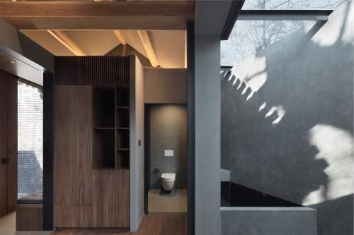 改造旧厂房来当自己的设计工作室,是设计师们的选择习惯。2014 年,青山周平在北京创建了自己建筑设计事务所 B.L.U.E.,这个建筑设计事务所也是从旧厂房中改造而来,在他的初想中要把其中两个空间之间的隔墙打通,一锤一锤的敲下去,发现那堵墙竟然此墙为结构墙,于是被迫放弃,没凿成功的墙,却成功的留下了一扇门。