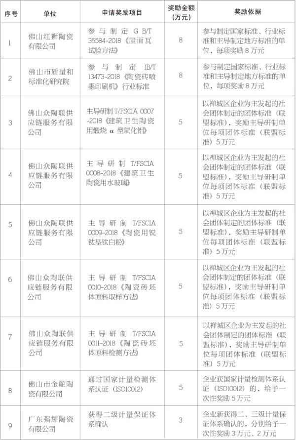 近期,佛山、江门、清远相继发布多个相关文件,拟对部分企业颁发扶持奖励金,其中包括推进品牌和技术标准战略拟扶持奖励项目、2018年度第一批小微企业上规模扶持资金项目、2020年度打好污染防治攻坚专项资金(绿色发展用途)项目等。佛山、江门、清远三地共有十几家陶瓷卫浴相关企业入选项目扶持奖励金名单。