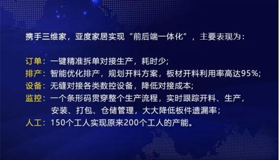 2017年开始与三维家合作的亚度,在经过了两年的磨合后,到2019年初已有60-70%的产品通过三维家软件下单完成。到2019年的7月1日,更是在内部发文宣布:“全面用三维家系统实现“一键通生产”,这标志着亚度家居已经依靠着三维家的这套系统完全实现了设计生产端的“前后一体化“。