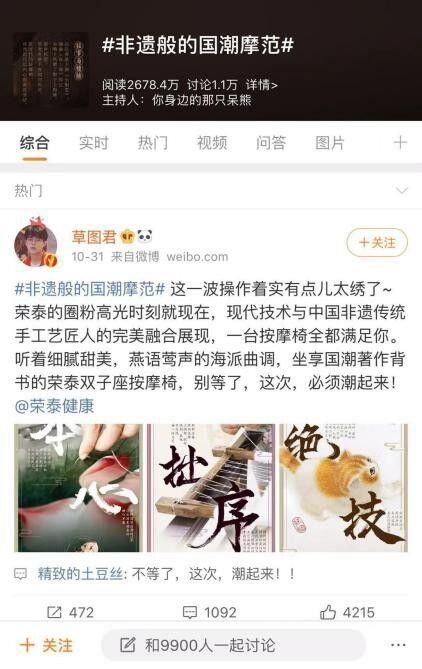 对比其他品牌,对传播层面颇有见解的荣泰,先是利用一拨海派国潮风预热宣传吊足大众胃口,海派悬念海报发出,宣告与非遗大师强强联合,引发网友热议,获赞一片。