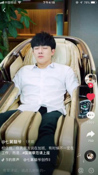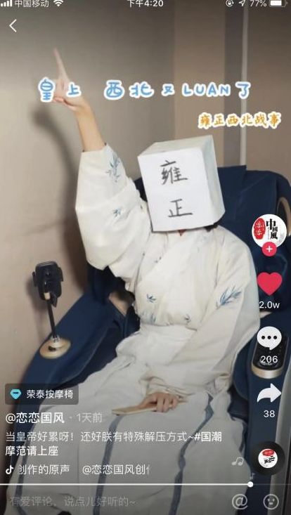 比起单一宣传主旨和产品卖点的品牌来说,荣泰更加注重的是与用户的交互性,结合本品牌特性,利用抖音发布荣泰官方视频,同时发起“国潮摩范 请上座”挑战赛。传播输出内容不仅传统文化底蕴十足,还巧妙与现代科技结合,有效的强化了社交属性和品牌关联性。