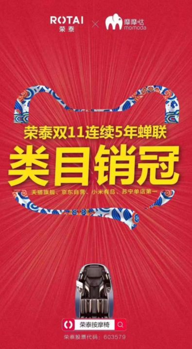今年,荣泰双11全网销售过亿,这也是荣泰连续五年蝉联类目第一,真正的实现了“走进千家万户,服务亿万人群”。