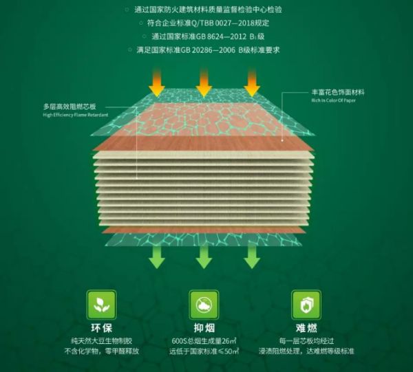 每一层板芯均经过浸渍阻燃处理,600S总烟生成量26㎡,远低于国家标准≤50㎡。经过国家防火建筑材料质量监督检测中心检测,能达到阻燃等级B1(B-s2,d0,t1)级的规范要求,起到较好的阻燃作用,减缓火势的蔓延。