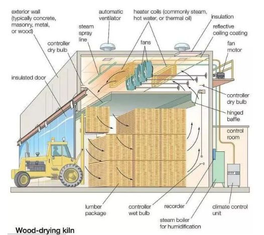 木材常规干燥是指以常压湿空气作干燥介质,以蒸汽、热水、炉气或热油作热源,间接加热空气,干燥介质温度在100℃以下的干燥方法。若干燥介质温度在100℃以上,则称为高温干燥。