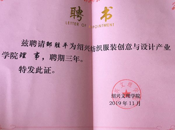本次仪式,雅诗澜品牌创始人邹胜平被聘为绍兴纺织服装创意与设计产业学院理事。