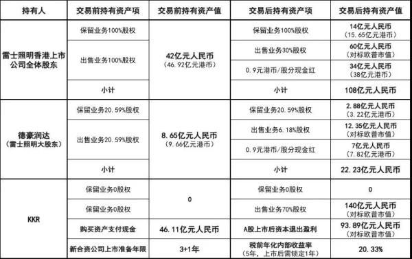 出售事项之后,雷士照明香港上市公司留下的业务包括:中国保留业务、中国ODM业务以及国际业务。本次交易双方还约定,雷士照明有权在交割日之后的第二年推荐A股上市计划,若KKR在现有交易基础上产生不低于18%的年化内部收益率(税后),则KKR应批准计划并提供配合。