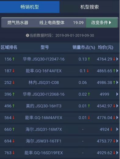 从奥维数据罗盘采集的数据可以看出,以线上燃气热水器单品销量市占比例统计,市场上的产品还是很多的,其中零售排行榜爆款产品的主要品牌,包括华帝、能率、林内、美的、海尔等主流大品牌。具体来说,今年9月份以来华帝燃气热水器i12047型号名列榜首,其次是能率和林内的两款单品,华帝的另外一款单品i12068型号也紧随其后。