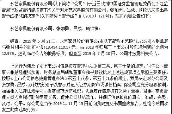 日前,永艺家具公司收到浙江证监局警示函,该公司因为收到一笔1349.4万元的政府补助未及时公告,该公司,以及公司董事长兼总经理张加勇、财务总监吕成、董秘顾钦杭被记入证券期货市场诚信档案。