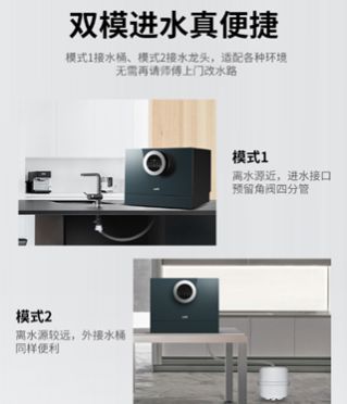 产品可以放在洗衣机上,可以放在橱柜上,也可以放在餐桌上等,放哪都能洗,有电就能用。同时采用了双模进水的设计,模式一:可以外接水桶,适用于离水源较远的摆放位置;模式二:适用于离水源近的摆放位置,进水可以通过在原来的冷水管道上安装角阀四分管,排水管可以直接放到水槽里,轻松适应不同的厨房环境,担心家里无法安装完全是多余了。