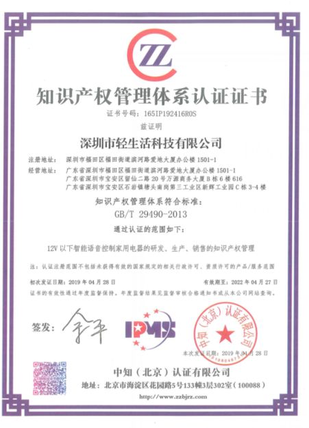 轻生活科技继承了母公司超维实业高度重视知识产权保护的血统,从建立公司开始,就对语音控制技术在各行业应用中的技术创新成果进行了知识产权保护,申请了国内外各种专利,包括中国的《发明专利》、《实用新型专利》,国际《PCT专利保护》、美国《发明专利》、中国香港地区的《短期专利》、中国的《软件著作权》等。很多《发明专利》通过了实审,目前已陆续收到正式的专利授权证书,形成比较稳固的专利权。
