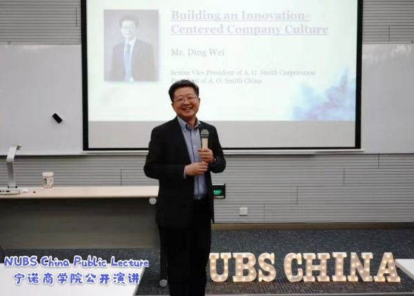 11月18日,A.O.史密斯集团公司高级副总裁兼中国投资公司总裁丁威先生,应宁波诺丁汉大学商学院之邀,为商学院中外师生进行连续两场英文演讲,分享“以创新为核心”的企业文化建设之道,深度解读企业成功密码。国际知名战略管理学教授、宁波诺丁汉大学商学院院长马丁•洛克特教授(Professor Martin Lockett)主持了这次分享会。