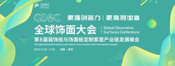 “更新创造力 更高附加值”2019全球饰面大会暨第八届装饰纸与饰面板定制家居产业链发展峰会于2019年11月20日-22日在常州白金汉爵大酒店举办。