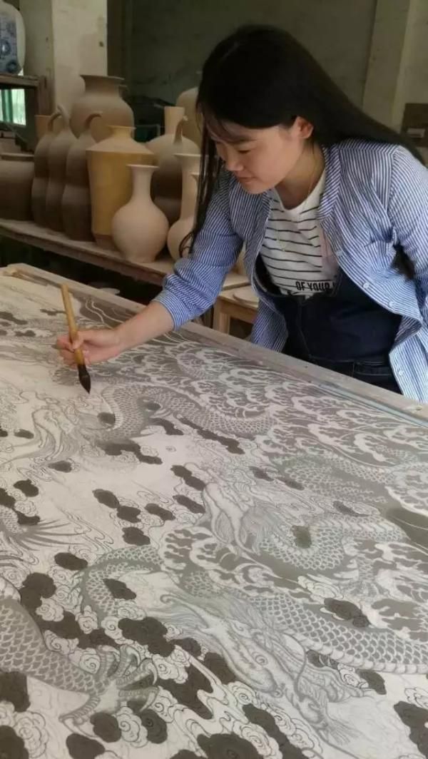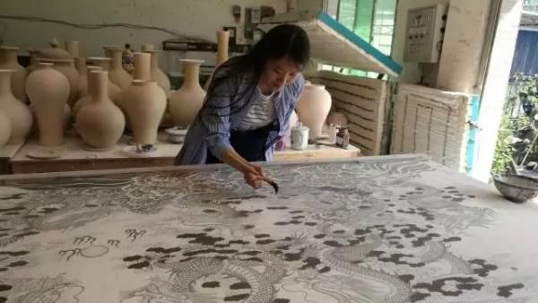 出于对龙的尊敬和喜爱,孙德娜老师创作了一幅高1米宽2米的九龙出海大型立体青花分水描金瓷板,本来业界在立体描金创新就非常少,加上九龙出海图瓷板克服了综合装饰的釉上釉下技术难点,通过中温和高温多次交替烧制而成,最后才成就了这幅世界上最大的立体青花分水描金瓷板。孙德娜老师形容完成此件作品的心情,就像一位数学爱好者解出了一道很难的几何题一样。目前九龙出海图瓷板已申报吉尼斯纪录,孙德娜老师希望通过传统工艺和技术创新的结合,并将其展示在大众面前,让更多人了解陶瓷,尊重陶瓷。