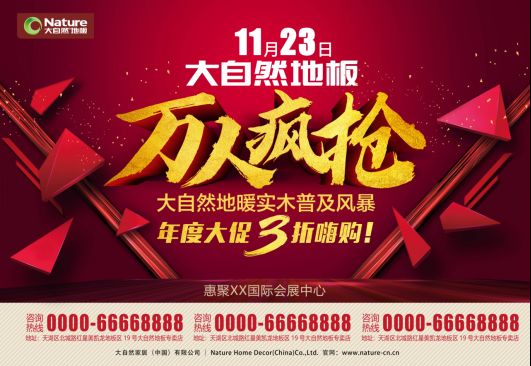 但是,大自然地板的福利活动并未正式落幕,随着天猫双十一的热度,11月大自然地板“万人疯抢”大促活动已经拉开帷幕了。据悉,此次优惠力度更大了,更是喊出了“年度大促3折嗨购”的口号,让我们一起看看大自然地板又带来什么惠民福利吧,在双十一没抢到地板的小伙伴们,要跟上步伐了!