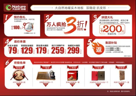 除此之外,此次万人疯抢活动更有预约有礼、疯抢3折、成功拼团享200元现金红包、抽免单等优惠活动,地暖实木地板售299元/㎡起,零醛智造地板129元/㎡起等钜惠产品为活动加持不少狂欢热度,想买地板的小伙伴赶紧动起来,具体详情请咨询当地门店。