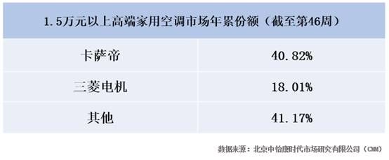 家电市场随时都在调整甚至洗牌,而近年来,中国高端空调市场格局开始偏向以年轻化为主导。据中怡康统计数据显示,截至第46周,在1.5万元以上家用空调市场,卡萨帝年累份额保持在40%以上,三菱电机年累份额18%以上。通过数据我们可以看出,年轻的卡萨帝空调虽然近几年才入市,但3年多的高端布局之下实现逆袭,拿下高端家用空调市场超4成份额,成为高端空调市场的支柱,与三菱电机共同主导高端空调行业的新格局。