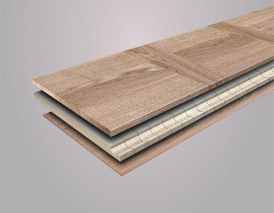 三层实木地板三层结构按照上中下三层纵横交错地黏合起来,面层、底层纵向排布,芯层横向排布,且芯层的实木条间留有一定空隙,便于面板和底板自身的膨胀,避免面板开裂、起鼓、变形现象。面、芯、底三层互相牵制又便于释放应力,地板能够在长时间内保持良好的形态。