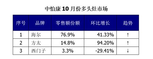 中怡康统计数据显示,从多头灶市场零售数据来看,海尔依然占据主要地位份额76.9%,方太14.8%,西门子3.3%,其中海尔多头灶实现高份额下的高增长,方太几乎实现翻番增长。从多头灶畅销榜单来看,TOP10榜单海尔占7款,方太2款,老板1款。