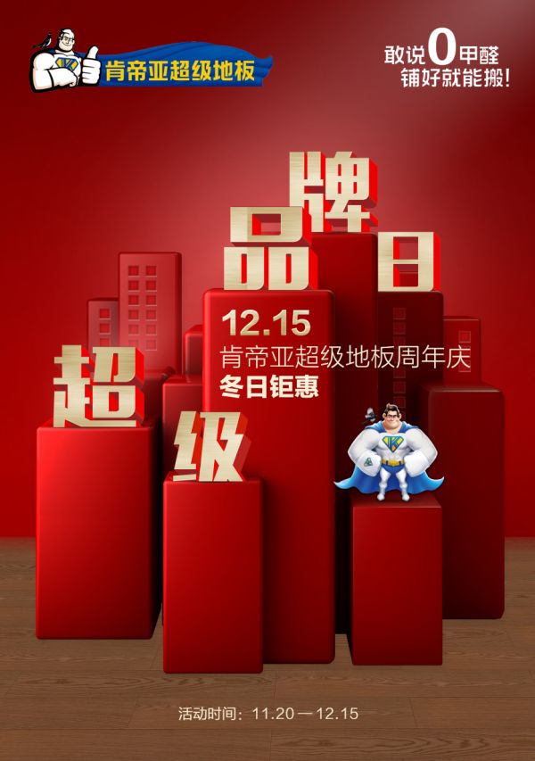 一年一度12月15日肯帝亚周年庆典,遇上肯帝亚超级品牌日,肯帝亚超级地板、实木地板、实木复合地板、强化地板全品类地板产品火爆促销中!