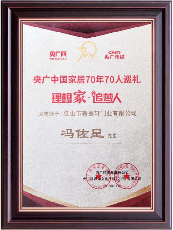 11月19日,“理想家·追梦人”中国家居70年70人巡礼颁奖典礼暨2020央广大家居助力计划沟通会在广州隆重举行,凭借着高质量发展与对中国门窗行业的卓越贡献,新豪轩门窗荣获“中国家居70年70人巡礼荣誉单位”,新豪轩门窗营销副总经理冯佐星先生荣获“中国家居70年70人巡礼企业家”称号。