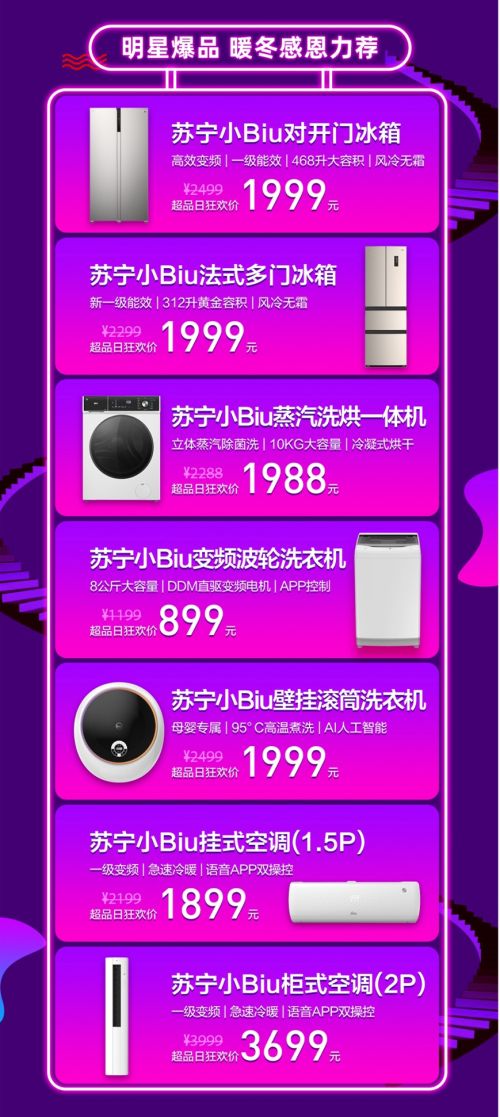 冬季居家想要快乐肥宅,就不得不想办法逃避劳动了,比如选择苏宁小Biu蒸汽洗烘一体机。10KG大容量,一次性放进全家衣物,缩短劳动时间;立体蒸汽除菌洗,刷新你认知的干净,洗衣质量有保证;最后进行冷凝式烘干,省去晾衣烦恼。超品日狂欢价仅需1988元,谁能抵抗诱惑不买它呢?当然了,想让爸妈休息一会儿,享受生活是不太可能的。所以千元以内的小Biu变频波轮洗衣机,送给爸妈再合适不过了。8公斤大容量,智能判断衣物重量,自动调整水量和洗涤逻辑,最大程度上解放爸妈的双手。虽然省钱我们可能没有爸妈在行,但是反季低价买好物的小聪明还是有的。一级变频高配置的1.5匹小Biu挂式空调超品日狂欢价仅需1899元,2匹柜式空调更是直降超千元,此时不买更待何时!