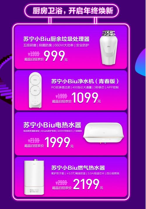 明星爆款趁着苏宁小Biu超品日大力度感恩回馈Biu粉,小Biu家族的新成员也不甘示弱。苏宁小Biu净水机(青春版)虽上市不久,但是硬实力相当过关。RO反渗透膜加持,让杂质无所遁形;400加仑大通量,拒绝管道二次污染。在这个感恩节喝上即滤即饮的鲜活水仅需1099元。解决了饮用水,苏宁小Biu也能承包你的洗澡水。无论是微笑海豚造型的小Biu电热水器还是深海贝壳设计的小Biu燃气热水器,都在创新颜值的同时,将安全做到了极致。4D防护系统给小Biu电热水器360°无死角的安全守护,超品日狂欢价仅需1999元。拥有CO安全防护和智能缺氧防护的小Biu燃气热水器则打出2199元的感恩回馈价,价格也足够温暖。