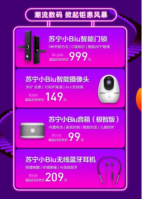 选购大家电打造了最舒适的居家条件,却总被生活中的琐事打断,不得不要出门?别担心,两千元内配齐小Biu潮流数码好物,冬季出门也要拥有满满幸福感。现在参与预定,给家里安装上五种开锁方式的小Biu智能门锁,潇洒出门,再也不用和钥匙捉迷藏;打开手机滑动监控画面,360°全景、1080P高清的小Biu智能摄像头,帮你看清家中一举一动,仅149元;戴上209元的小Biu蓝牙耳机,高品质好音乐,出门也能带上一份好心情
