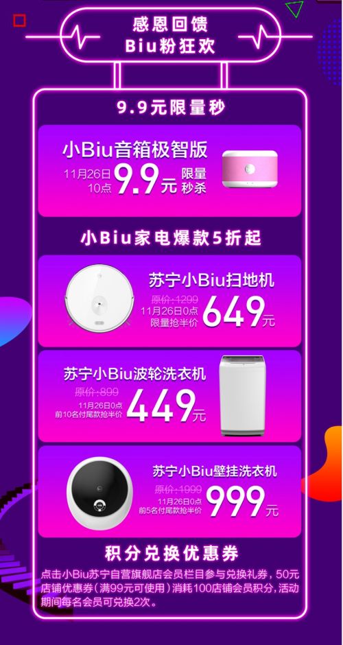 苏宁小Biu超品日,巅峰盛惠,感恩回馈不停歇。除了各大爆款家电产品纷纷打出狂欢低价外,小Biu还诚意满满的带来了9.9元限量秒杀和5折爆款家电活动。原价119元的苏宁小Biu音箱(极智版)11月26日10点限量秒杀仅需9.9元。更有小Biu扫地机、小Biu波轮洗衣机、小Biu壁挂洗衣机限量抢半价。搬好小板凳,定好小闹钟,考验手速的时候到了!