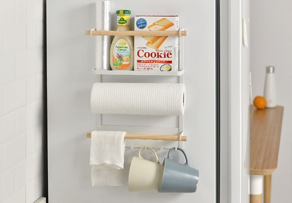 还有个厨房好物也要推荐给大家,就是冰箱挂架。这个挂架充分利用了隐藏空间,底部还配有小挂钩,物品可以分层放置,好用好拿,像保鲜袋、擦手巾、厨房纸等小物件都可以放上去,一一归置后看起来井井有条。