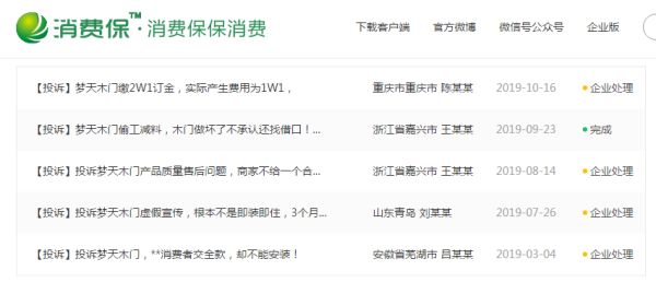 门框材料简单,施工质量堪忧,工期拖延,加盟商与总部相互推诿……2017年到2019年,关于梦天木门产品及服务的质量投诉在中国质量新闻网有所报道,在知乎等平台也常有投诉帖出现,评论点赞不在少数。