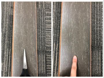 在日常生活中,地板总要和各种事物进行接触,小到鞋底的沙子,大到快递箱、家具家电,还有小孩、宠物在上面玩耍。一款优质的地板,想要在众多摩擦中保持表面的平整光滑,一定要具备良好的耐磨性能,如图所见,小编把剪刀的尖利一端指向地板,并在地板表面轻轻摩擦,把剪刀拿开后,地板的表面依旧平整如新,说明天格普尔托地暖实木地板经受住了考验。