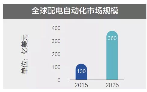 以全球配电自动化市场为例,根据 ABI Research 的预测数据,全球配电自动化市场将从 2015 年的 130 亿美元增加到 2025 年的 360 亿美元。(数据图片来源:华为)