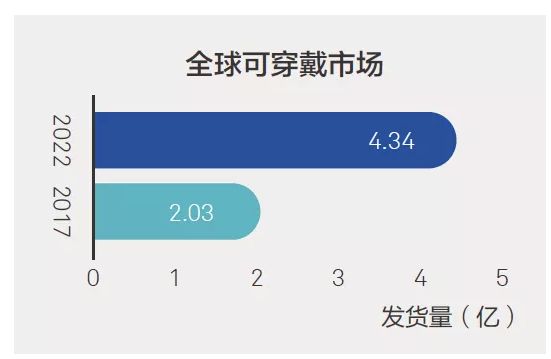 根据 ABI Research 估计,从 2017 年到 2022 年,可穿戴设备的年复合增长率将达到 16.4%,发货量从 2017 年的 2.03 亿件,到 2022 年的 4.34 亿件。(数据图片来源:华为)