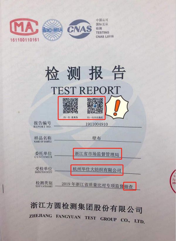 为了督促生产企业规范产品质量,浙江省市场监督管理局对浙江省本土品牌做了突击性的“抽样检验”并出具了检测报告,这次突击抽检意义重大,对浙江省乃至全国墙布市场的规范化都将起到重大而深远的影响。