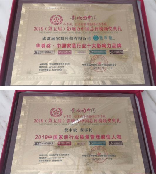 2019年11月22日-23日,2019(第五届)中国品牌影响力高峰会暨「华尊奖」影响力中国总评榜颁奖典礼在北京人民大会堂隆重召开。顾家猫董事长黄中斌先生受邀出席本次盛会,并荣获“中国家装行业十大影响力品牌”、“2019中国家装行业质量管理诚信人物”两项大奖。