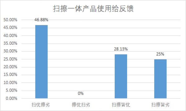 针对市面上出现的扫擦一体机,消费者的使用反馈有待提升。其中,只有28%的受访者表示扫擦功能均符合使用预期,而超过46%的人表示,扫擦一体产品的扫地功能强于擦地功能。数据表明,扫擦一体产品的擦地功能只是附属功能。