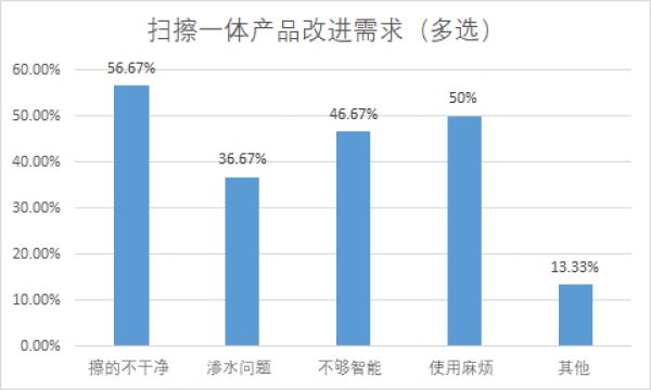 对于扫擦一体产品而言,有56%的人认为擦的不干净,近37%的消费者表示渗水问题严重,同时47%人认为智能化体验较差。50%的人表示自己购买的产品使用较为麻烦。