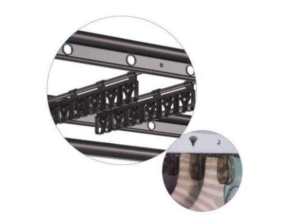 好太太奶爸机,设计了6杆横向的小晾杆,4排母婴夹,与大人的晾衣空间不冲突,实现了宝宝的独立晾晒空间。