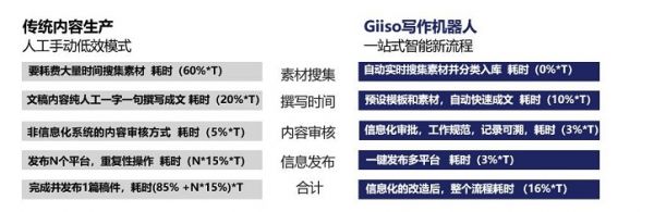 我们假设写作者采用传统方式完成1篇文章内容,并分发到1个平台,这样内容生产时间记作T,其中内容生产时间占据T*85%,在1个平台上的发布时间为15%*1,因此T= 85%+15%*1。而据统计,利用Giiso写作机器人辅助写作,内容生产时间仅占16%,系统自带的一键发布功能还可实现多平台发布,整个生产和发布流程几乎提升了10倍的效率。